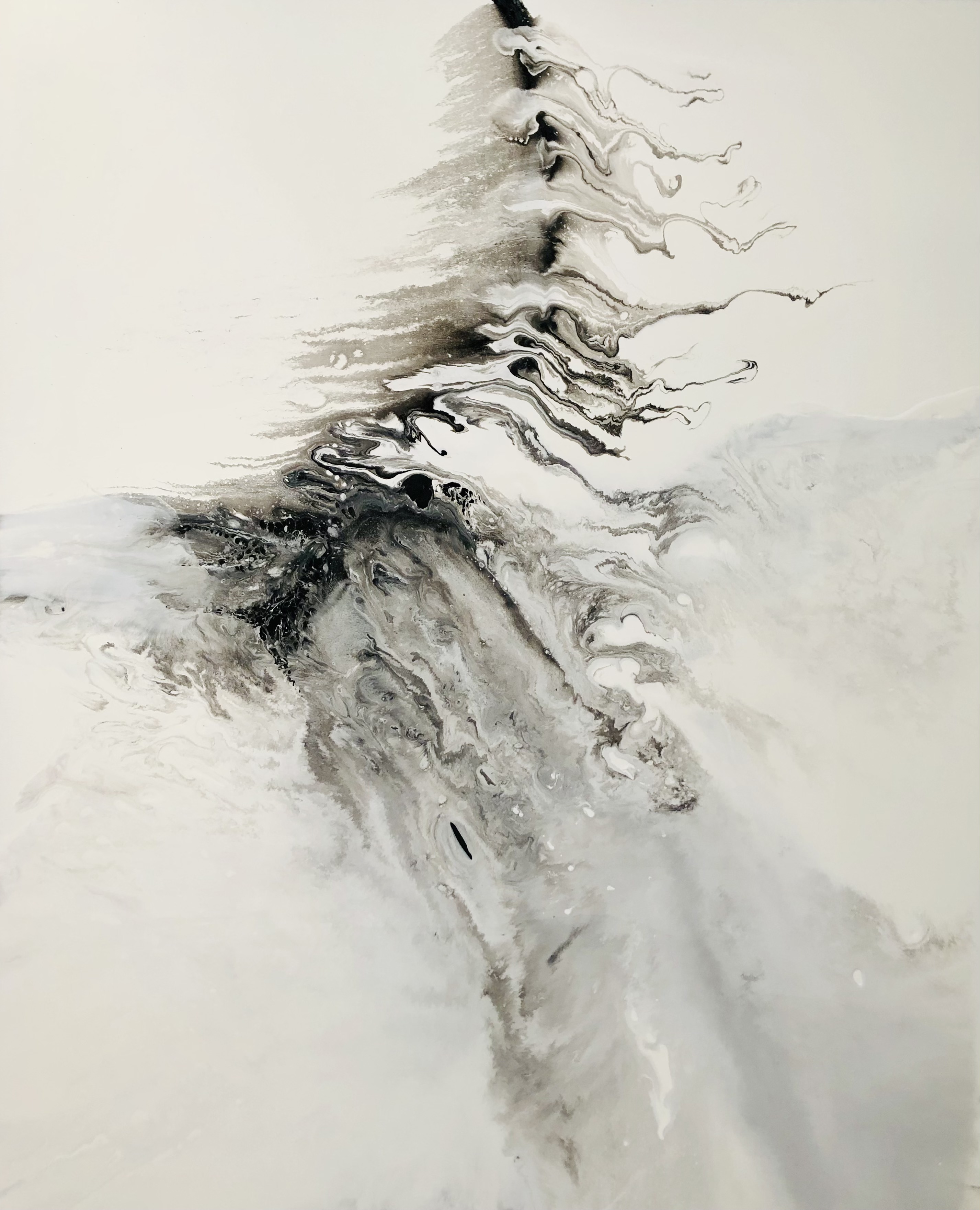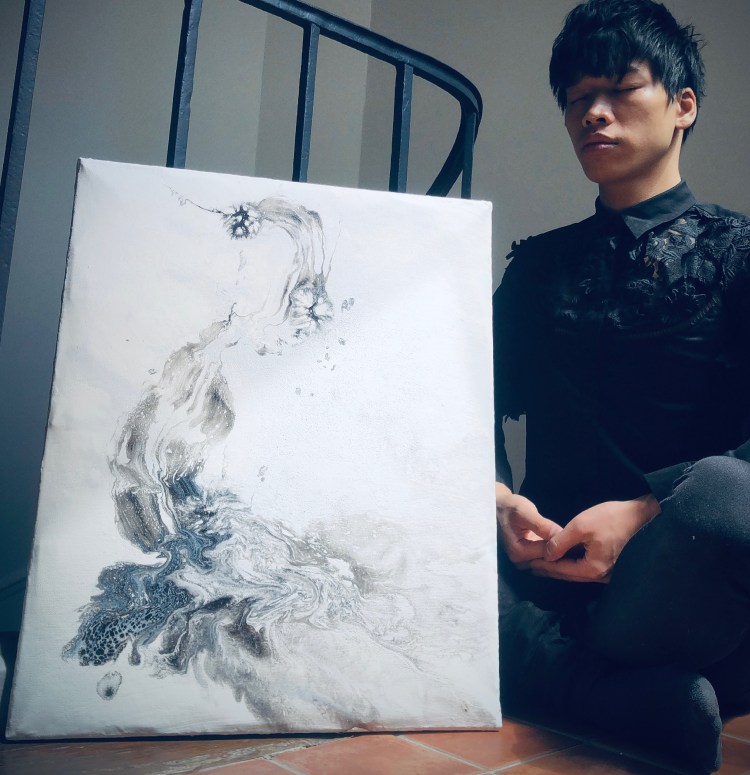 What have you been working on during these pandemic restrictions? It’s called “Zentmeter”, I am really happy I finished this collection. Using “centimeter” I changed the “C” to “Z” to give the element of Zen to my visuals. During the confinement, I felt a lot of pressure, like most of the people. We were sad, we were crying, we didn’t know the future during the confinement, so I didn’t want to use so much color, at that moment we didn’t see color, we lost a lot of color, so that’s why I use “Black and White” in the collection, it also adds a calm peaceful feeling, so people can feel my paintings. Influenced by traditional Chinese Ink paintings, I use acrylic but normally acrylic is so thick and its hard to make water shapes on canvas, so that’s why I use European techniques to make Chinese style designs.