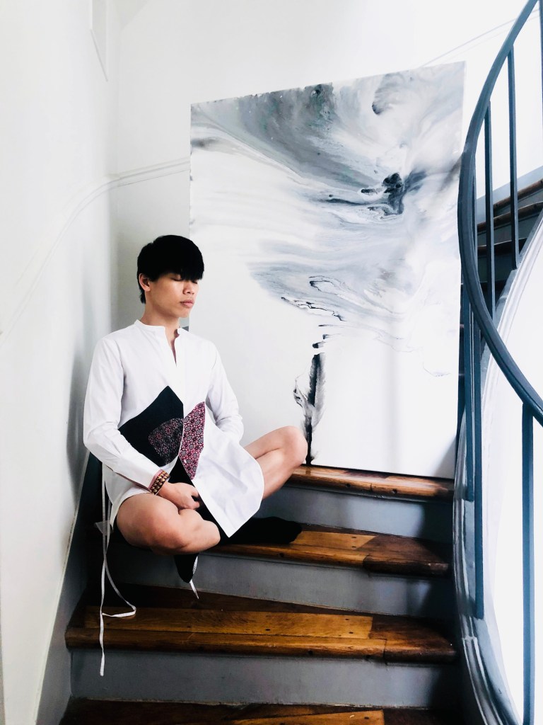 How to describe your fashion and art style here in Paris: I have a Fashion background, when we attend Fashion week, we must dress very fancy, very colorful, but actually that kind of thing is not really me. I mean when I dress up like that, I like it, but when we dress up and go there, it’s really only for working. If you dress up too simple, no one cares about you in Paris, because in Paris we can say they are very cliché, so I have no choice, I need to survive, its my work, I need to stand out, so I dress up very colorful, but I prefer the black and white, minimal like in my art. It’s a contrast, I like that. I was a monk in my past life.